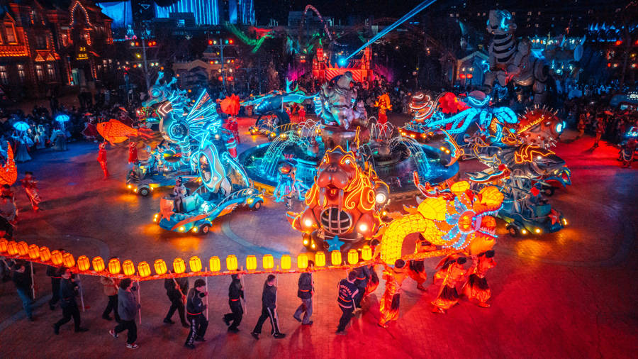 夜间,非遗板凳龙穿梭于极地小镇,八仙过海非遗彩船沿秋莲河巡游。1月1日-1月2日无人机烟花秀营造出浓郁的新年气氛。